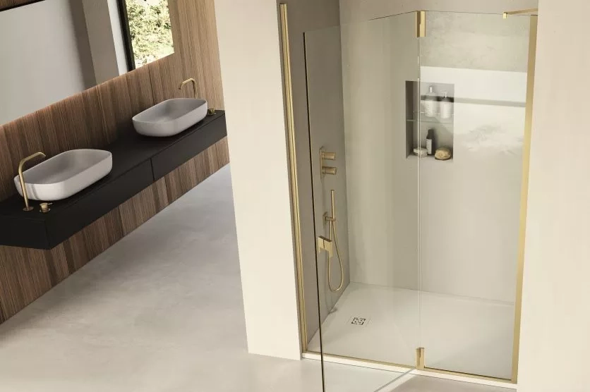 SuperSintesi est la nouvelle proposition pour une cabine de douche minimaliste avec porte battante sur charnières. Le verre trempé en 6 ou 8mm occupe l'espace.