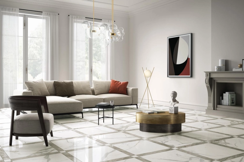 Coloris Calacatta Gold & Statuario Lux finition lappato ép. 0,90 cm 120x120 cm